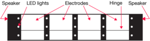 For this study I designed an instrument called Keppi, a percussion instrument in the form of a cylinder about 65cm long and 12cm in diameter. It has four large electrodes that wrap around the body of the instrument, interspersed with five rows of LED lights, and speakers embedded in either end of the cylinder. When the performer taps one of the four electrodes, the embedded computer receives a trigger via capacitive touch and triggers a sample, applying a velocity based on the signal generated by the piezo network underneath the electrode that was tapped.