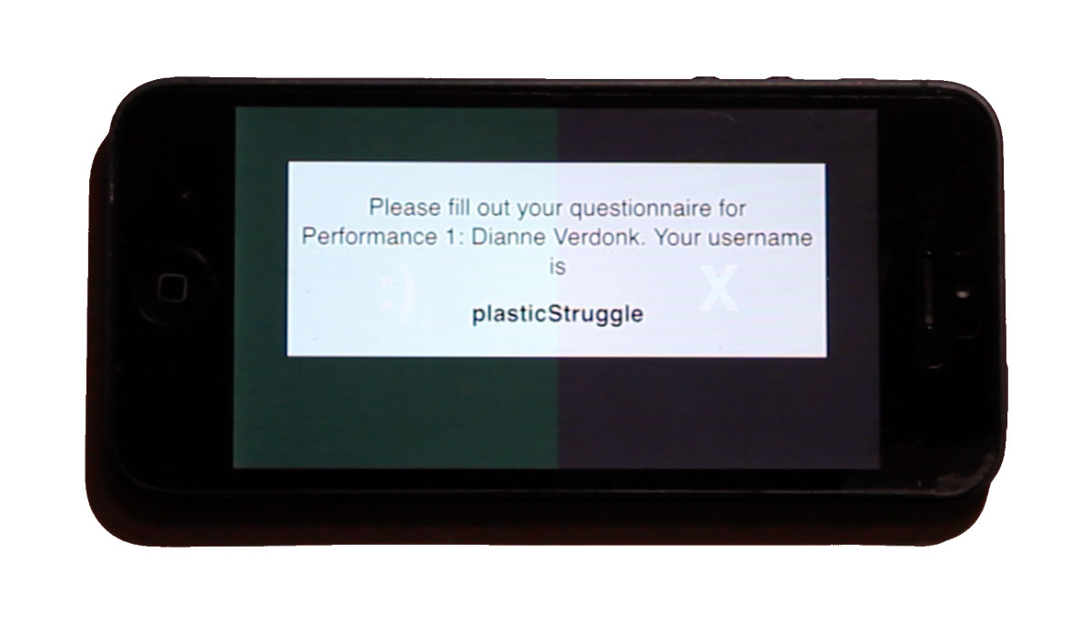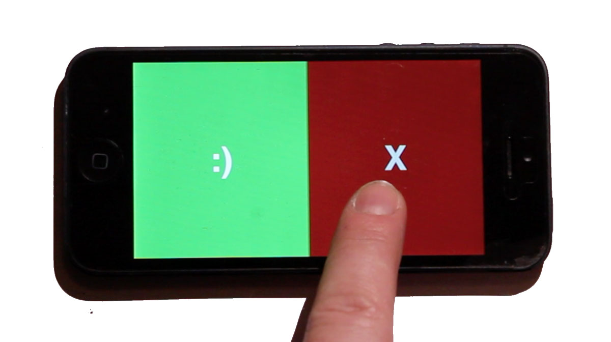 Audiences were free to press these buttons as often as they saw fit: They were free to press them frequently, occasionally, or not at all, and to decide when the performance warranted their indication. As the buttons could both be pressed at once, the `enjoyment’ and `error’ states were also independent in function. Additionally, the use of the entire side of a phone screen means that audiences can use two thumbs to tap the buttons, and don’t require looking for and finding specific active areas of the screen. Using both sides of the screen does not rely on any button-pressing accuracy, does not require the participant to remember multiple button functions, or and also does not require them to monitor and think about multiple internal emotional states.